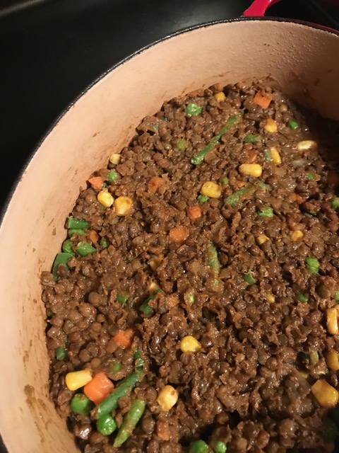 I began with the lentils. First I sautéed some onions and garlic, then added 4 cups of vegetable broth and 2 cups of brown or green lentils with your preferred spices (we like things hot, so we had smoked paprika, chipotle, and some chile pepper, along with salt and black pepper). Bring that to a boil, then turn down the heat and let it simmer for about 45 minutes. At that point, the lentils should be at a consistency similar to sautéed ground beef (or lamb, as the original recipe required). Then I added in a package of frozen mixed vegetables (corn, peas, carrots, green beans, etc.) and let those heat up.