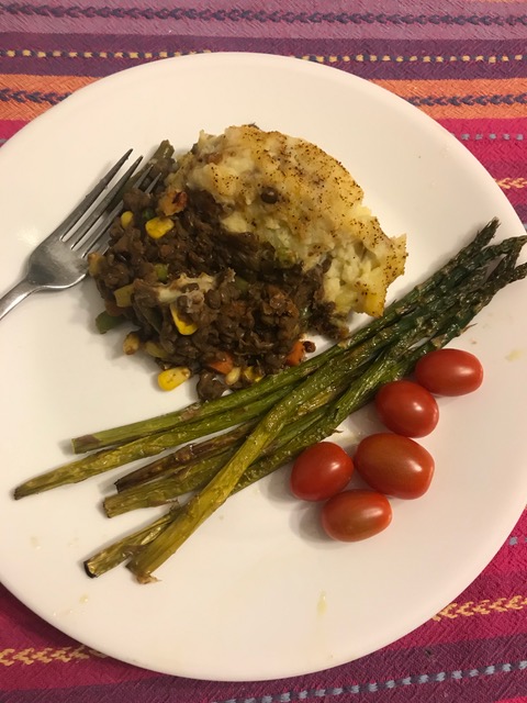 I thought I would share my recipe for today’s meatless entree because it fits well under stay-at-home regulations. We had Lentil Shepards Pie, the main ingredients of which can last in the pantry or freezer for several weeks.