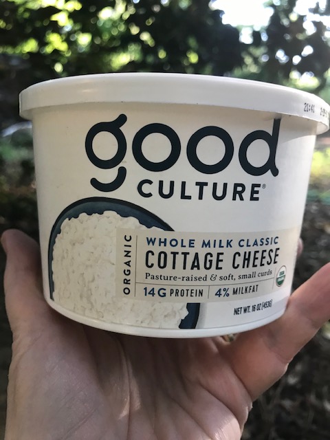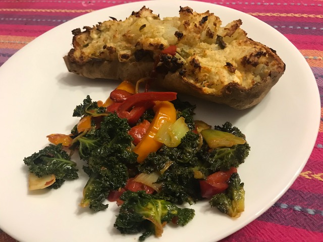 I based the main course on a dish that I learned from an former work colleague who came from Boston and introduced to what she called “spuds and curds.” Basically, it is just a baked potato with cottage cheese instead of butter and/or sour cream. I actually had never tried it. But my grocery store had a really good sale on a new variety of organic cottage cheese from milk from pasture-raised cattle not treated with rBST with no artificial ingredients but with some probiotic cultures (similar to yogurt). So I decided to try it.