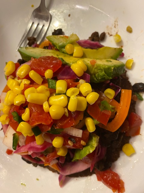 This meal was inspired by a dear friend who is the only person who has fed me during these coronavirus times (other than take out from restaurants). We visited outside–socially distanced, of course– in her IDYLIC yard, complete with running water, resident deer, and Buddha statues. I hadn’t expected food, but she served me her latest food passion, which was baked tostados. My friend is an artist, so she was all about the colors, so she included red (really purple) cabbage on her delicious treats.