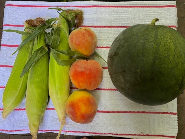 I went to the Cary Downtown Farmers Market the morning of July 4th, and was delighted with what I found. It was the first of the local organic-ish corn, peaches, and watermelon. The Market is bursting with fruits and vegetables right now.