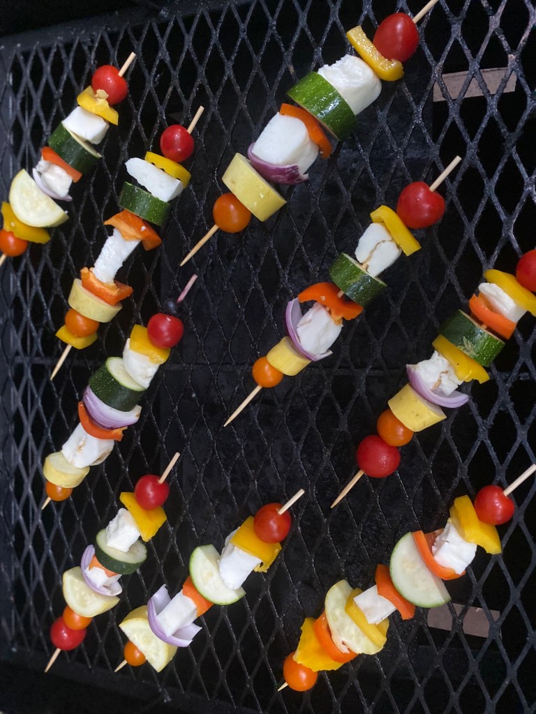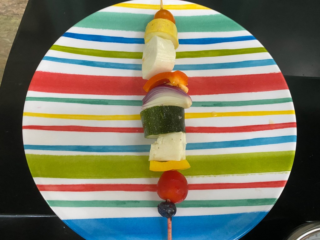 I had red and orange cherry tomatoes, green and yellow squash, orange and yellow peppers, and a purple onion, along with hunks of the cheese. I stuck a blueberry on the end so we would have all the colors, but they didn’t make through the grilling, honestly.