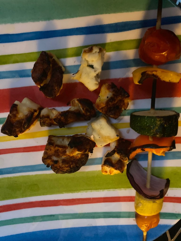 I think in the future, I would just cut the block of cheese in half depth wise, if you know what I mean, and grill both pieces whole, then cut them in cubes after the grilling is done and add them to the skewers or the the flatbread/tortilla/whatever. I had some issues with the mechanics, but the tastes were great.