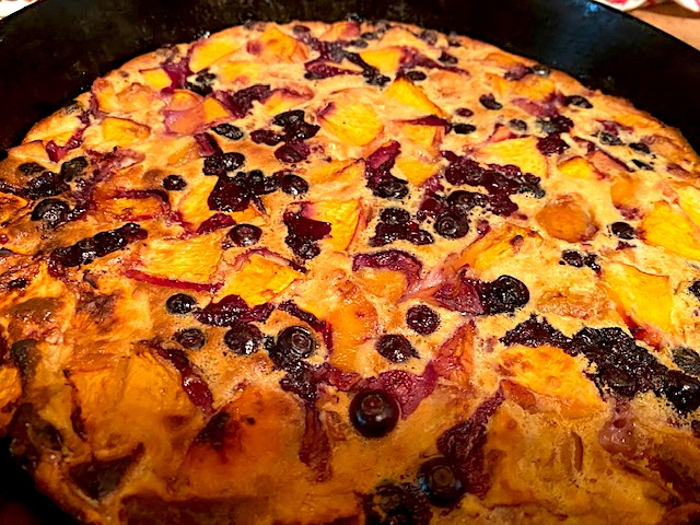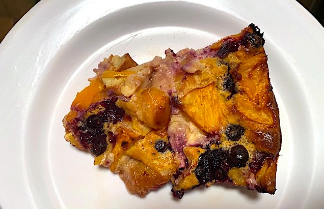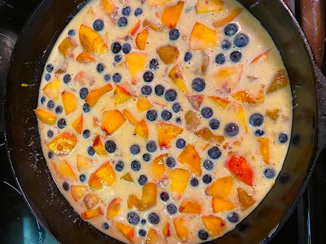 While everything was cooking I whipped up dessert. I made a French dessert I had never heard of called a Fruit Clafoutis. It was really simple–a batter of milk and eggs from Queen B Farm, sugar, flour, and vanilla, topped with sliced PEACHES (YUM!) from Rob’s Fresh Produce and blueberries from Parker Farm. That went into the oven about the time the ratatouille and lentils were done and had to bake for 50 minutes.
