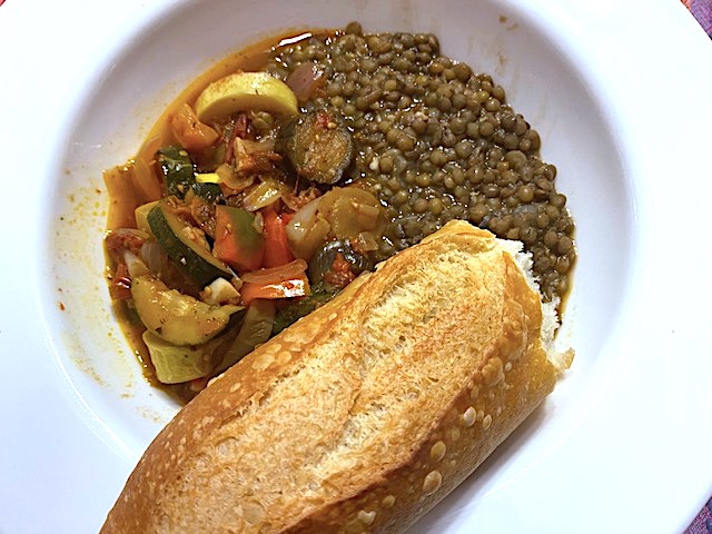 Meanwhile, I popped a pound of French lentils into my Instant Pot with garlic and thyme and 6 cups of water, put it on high pressure for 10 minutes, and soon had lentils to go with my ratatouille. I had bought a fresh-baked baguette at a local bakery this morning to soak up the juices.