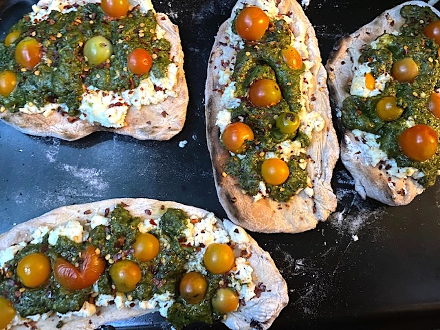 So ricotta, then pesto. Then I topped it off with some cherry tomatoes from LB Farm. I added some commercial red pepper flakes, although I’m hoping to make some of my own once some of my hot peppers dry.