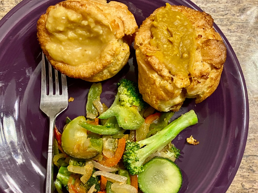 As I expected, the curry version was more popular than the plain version in our household. But both my menfolk were so delighted to have another round of fresh Yorkshire puddings they would probably have eaten anything in them. It wasn’t my greatest meal, but I think it will be a memorable one.