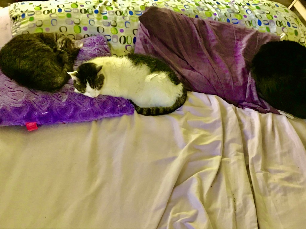 So it made me be more patient about tending to them, especially first thing in the morning when they wanted food, water, and attention at the same time that I was tending to my early morning needs. I also did a better job of making the bed on top to cover my pillows, but put a series of pillows at the food of the bed for their use (except when I “borrowed” the purple fuzzy pillow during yoga or meditation).