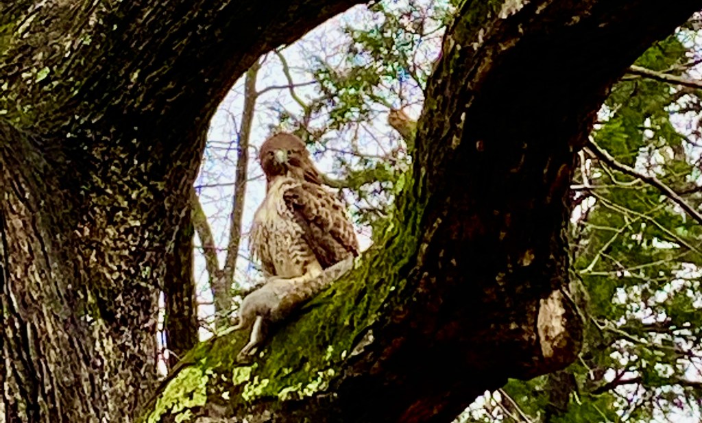 I took this picture with my iPhone this morning (so sorry for the mediocre quality). It was a red tailed hawk that was looking at me while I was looking at him. We had quite a nice energetic exchange, which inspired me to think about how much I have enjoyed my time with animals during these month of sheltering at home.