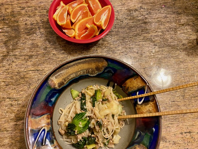 My son had quite an evening of it all. It turned out that his college had a two-and-a-half hour Zoom Lunar New Year festival right before his radio show, which featured two hours of pan-Asian music. Because he was tied up all evening, we ended up eating the last of the General Tso’s Cauliflower I made earlier this week (which actually worked really well as leftovers, yum). Tonight we had our New Year feast of longevity noodles with spicy pork and bok choy (a traditional dish for health and wellness for the year) and oranges (which represent gold for prosperity).