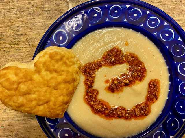 The savory heart biscuit I ended up serving along with a vegan creamy cauliflower soup I made for dinner, garnished with a Szechuan chile crisp sauce (SANS the traditional peanuts), which I thought made a lovely Valentines first course: