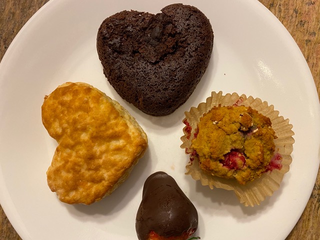 I got to the Center and handed out my brownies. Then someone else showed up with a plate of wonderful chocolate oatmeal peppermint cookies, which were DELISH. Mine didn’t last long enough to take a picture of them, LOL. Plus one of my friends gave me some strawberries dipped in chocolate that she made herself, and another gave us some cranberry-white chocolate muffins. And when I got home, I found that my husband had brought home some cute heart-shaped biscuits from the place he went for breakfast.