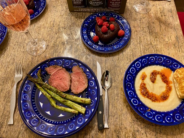 The main course was grass-fed, organic-ish roast beef from the Farmers Market, along with roast asparagus. Because I’m trying to follow the Planetary Health Diet, or so-called “Grandparents Diet” (click here for more details about this diet intended to feed the 10 billion people expected by 2050 in a healthy and sustainable way), I only serve beef once a month, so that is a treat for us. I also try not to buy much produce out of season because of the energy cost of flying it up from South America or wherever, so the asparagus in February was a rare treat as well. But SOOOO good…