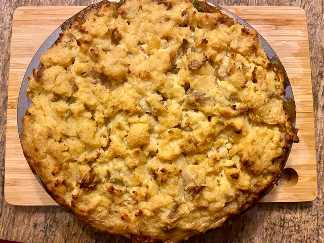 Nobody is ever going to mistake this for a meat-based Shepards Pie. But it is tasty and hardy and feels like comfort food even though it is healthier than the meat pie. Plus it checks off two of the current holidays, so it feels like a Scrabble-double-points celebration meal.