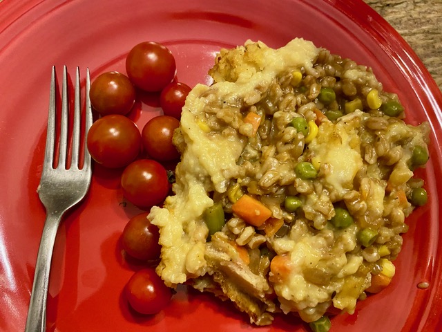 Most of the vegetarian Shepards Pie recipes I saw, at least those that don’t use nuts and/or mushrooms (both of which I’m allergic to), replace the meat with lentils. However, I used farro because I think it has a more meat-like texture. It has some chew to it, which at least my lentils usually don’t. I cooked the farro in the Instant Pot while I boiled potatoes for the topping. I made a roux to thicken vegetable broth cooked with sauteed onions and garlic and frozen organic mixed vegetables and mixed in the farro and spices, particularly thyme and paprika. Then I heated up some milk and vegan margarine to combined with the potatoes for mashed potatoes. It was a rolled-up pie crust dough, so I unrolled it and fit it into the pan, added the farro and veggies and gravy mixture, and topped it with the mashed potatoes. Then I cooked it served it piping hot for dinner with some cherry tomatoes from the Farmers Market (so that isn’t particularly Irish, I realize, but they are circular so that fits with Pi Day, right?).