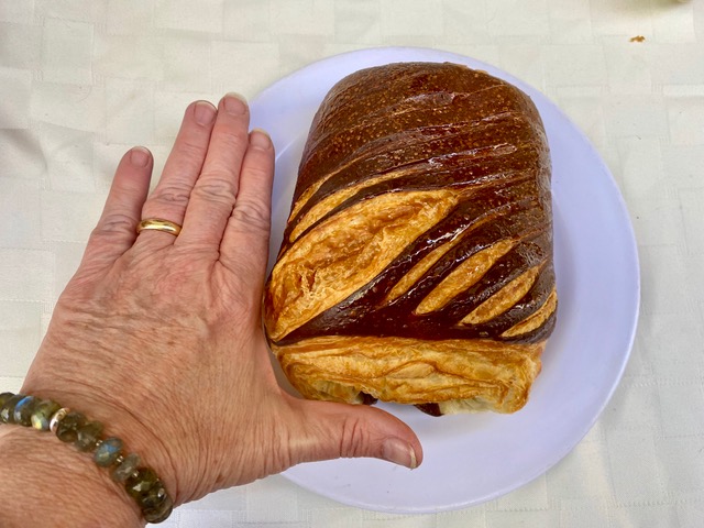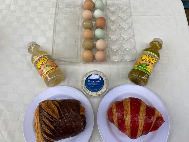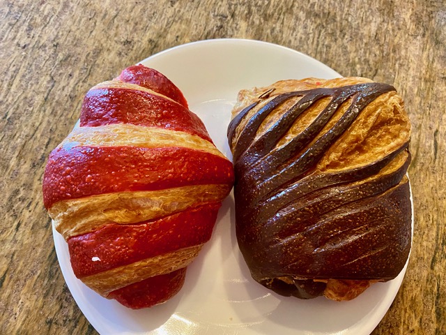 A new vendor this year showed up with the most incredible-looking croissants. The one on the left is chocolate; the one on the right is strawberry-passion fruit. And to give you a better perspective of their size: