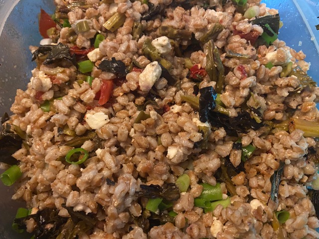Farro is easy to cook as well. For this salad, I put 2 cups of farro in 5 cups of water and cooked it for 10 minutes in the Instant Pot. While it was cooking, I roasted some tomatoes from Parker Farm (Cary Downtown Farmers Market) and some pak choy, which is similar to baby bok choy from Meadowhawk Farm (CDFM). Once both of those are done, I chop the vegetables and add them to the warm farro. I also chop up some scallions (not sure which of those farms I bought them from, because I buy them from them both because we eat lots of onions here) and crumble some feta cheese into the grains. Of course, vegans could easily leave out the feta, or perhaps substitute some tofu for added protein (although farro is a fairly protein-dense grain). I pour on a vinaigrette sauce while it’s warm; supposedly, grains absorb sauces better when they are warm.