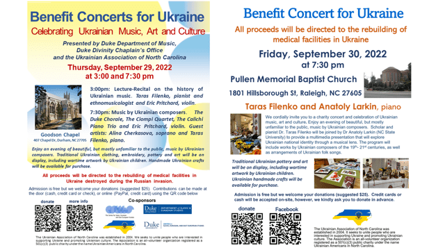 For those of us in the Triangle NC area, next week there are also some live opportunities to discover more about Ukrainian arts and culture. The Ukrainian Association of North Carolina (https://www.facebook.com/UkrainianAssociationNC) is sponsoring a few benefit concerts to raise money to rebuild medical facilities in Ukraine. First, on Thursday, September 29, Duke University will present two event, one at 3:00 PM and one at 7:30 PM, at the Goodson Chapel, 407 Chapel Dr, Durham, NC 27705. The first is a lecture/recital on the history of Ukrainian music; the second will be a concert involving several different musical organizations at Duke presenting music by Ukrainian composers. Other traditional Ukrainian arts, such as pottery and embroidery, will also be on display and available for purchase. The events are free, but the suggested donation is $25/person.