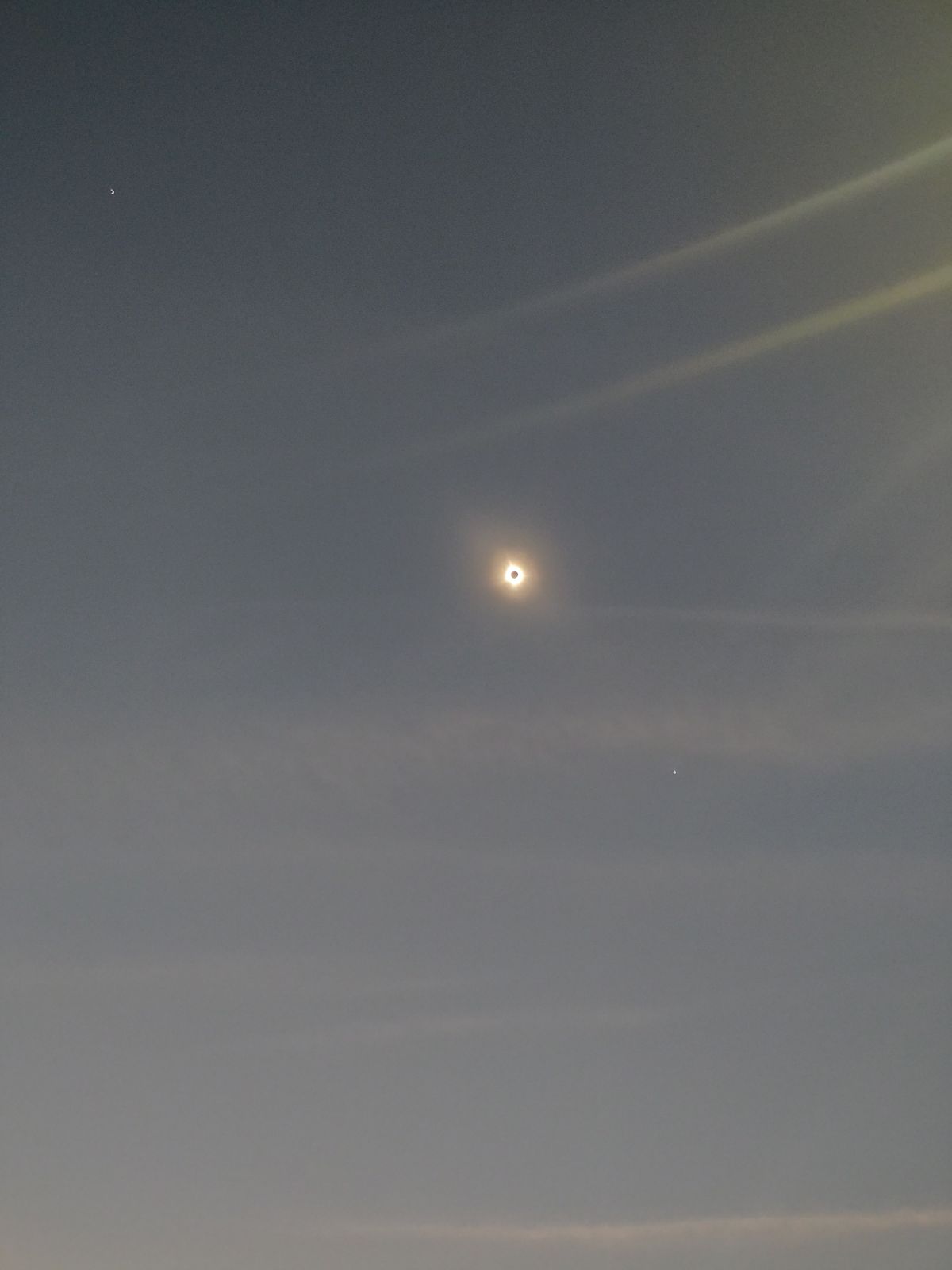I was also texting with my son, whose college was having an event (which is where the first two pictures came from), and my husband, who was down in our house in New Bern, and my friends near and far. So while I experienced this solar eclipse by myself, I also felt like I was experiencing it with friends all over. In addition to my friend in Indiana, one of my brothers traveled to totality site Canton, Ohio with his wife and dogs (note: dogs did not like the total eclipse). But my brother? His description was “Magnificent.” Still, lots of us here in NC were texting comments and photos between ourselves. In between, I was watching the NASA live feed that showed pictures from cities in totality as well as research flights above the ground.