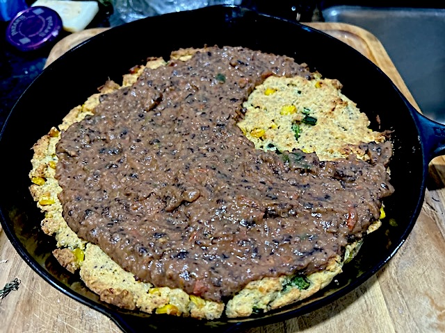 What I decided to do was to make some cornbread for the sun and some refried black beans for the moon. I used a cornbread recipe from a cookbook my vegan brother who lived in New Mexico for many years gaveq me for Christmas on vegan Native American cooking: