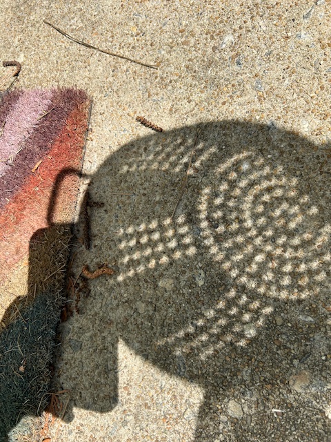 If you take an object like a colander with small holes and place it in the sun’s rays, it breaks the sun’s light into small pictures of the sun on the ground. So here you can see that a portion of the sun is missing, which shows the portion being blocked by the moon. I know it’s not a great picture, but it was clearer to see in real life.