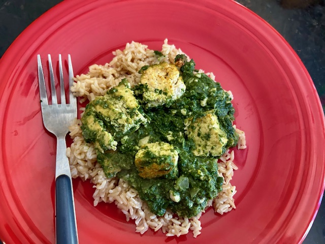 But then there is the Paneer part. That is cheese, and we aren’t doing cheese this month. But I thought, I bet tofu could make a good substitute. Now in our program, we aren’t supposed to eat processed food, and tofu is a processed food. However, I am allergic to nuts, and nuts are a major protein substitute for meat and dairy in our program. Given that allergy, Dr. Cheryl agreed that I could use tofu as one of my protein sources, even though it is a processed food. She is more interested in keeping us all healthy than having rigid rules that don’t serve us. Since tofu was on my approved list, I used it. Other people on the program can use it after the first two weeks, so this may also work for for others in the weeks to come.