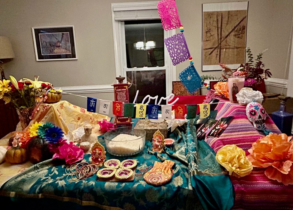 So here is the great community Hallowalimuertos altar as of Day 1. So it’s a little chaotic, but contains lots of great elements. Honestly, I’m not really the best at laying things out, so maybe someone will drop by and help me make it a bit more orderly? attractive? I’m open to feedback.
