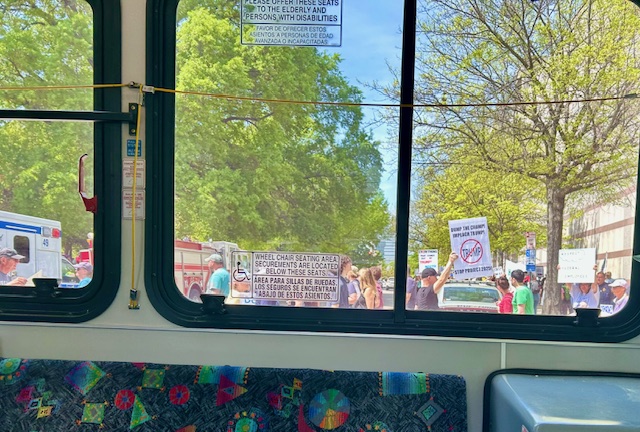 A few of us took a local bus down to the rally site, which was environmentally friendly (remember, it’s Earth Day this month) as well as cheap and easy. No hassles with traffic or parking! It turned out that everyone on the bus was going to the rally as well, so we had a very friendly ride downtown.