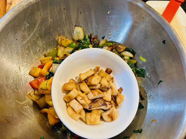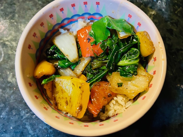 Now, the observant among you might be thinking, “But mushrooms, leeks, and kale are not red, yellow, and orange.” And you would be right. We decided to flesh this out a bit by adding multicolored bell peppers–red, orange, yellow, and green. That represents Dr. King’s work with people of all colors. The civil rights movement he led not only raised the status of Black people. It led to a better life for all Americans–Black, White, Hispanic, Asian, Indigenous, etc. So we thought it was an appropriate addition to our stir fry.