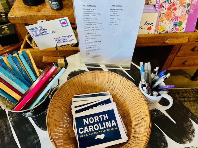 All in all, it was kind of the epitome of Fighting Back With Fierce Joy. No one in the room likes the fact we have to face these kinds of circumstances. But I think we all left buoyed up by the fact that we are operating as the face of true democracy–and we are not alone in doing so. I know I certainly was! The only disappointment for me was that this was happening in Apex and not in my home community of Cary. But believe me, I will contact my own mayor and Town Council and urge them to do something similar in our area.
