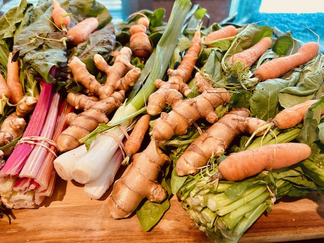 It may be hard to see, but I got rainbow chard, scallions, gai choy, spinach, and chives as my greens. One of our regular season (which is April through October) vendors came back a couple of weeks early with fresh turmeric (the brown knobby things) and the first carrots of the year! So I knew I had the ingredients for some great Spring meals this week.